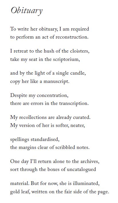 This isn’t your average bereavement story: Redford was only 35 and had a young child at the time that her wife died of cancer. We don’t hear so much about being widowed early, or in a same-sex partnership. Redford interrogates the expectations of widowhood (“If not Victoria, I can be Jackie O”) through biographical poems about Mary Shelley’s writings in the wake of Percy Bysshe Shelley’s untimely death. There’s a found/collage poem pieced together from one of Shelley’s letters; others quote from her Frankenstein and The Last Man. Elsewhere, Redford alludes to Woolf, Wordsworth and Wuthering Heights. Redford recalls feeling bombarded by people’s sympathy (“The flowers arrive like a tsunami”) and having no idea how to respond when asked how she’s doing. She relives moments from their carefree courtship days, lists the elements of “Her Last Day,” and documents the rituals that enshrine memory. I loved the archival vocabulary of “Obituary” (below) and how belongings left behind take on outsize significance: “I cross-examine every page of her notebooks, lay out the contents of each drawer in a crescent on the floor as if they are grave goods selected for her journey to the afterlife” (from “Circles”). The alliteration and nature (especially seaside) imagery were just right for me. From the hardest of circumstances came something tender and lovely.