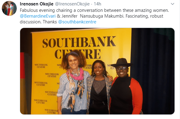 Through a giveaway on Eric’s blog, I won tickets to see Bernardine Evaristo and Jennifer Nansubuga Makumbi speak about their latest books at the London Literature Festival (this year’s theme: “Once Upon Our Times”) at the Southbank Centre yesterday. It was great to meet up with fellow bloggers Eric and Eleanor to hear these two black women writers read from their recent work and discuss feminism, the political landscape for writers of African descent, and their experiments with form.