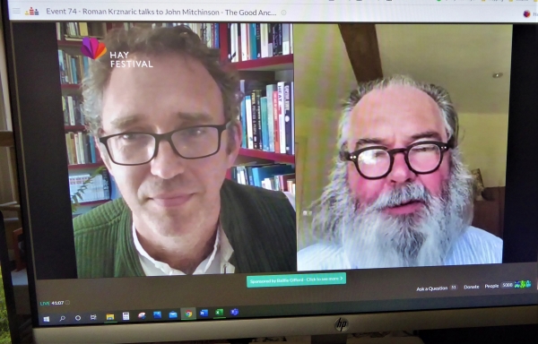 Roman Krznaric at Hay Festival. Q&A led by John Mitchinson (right).