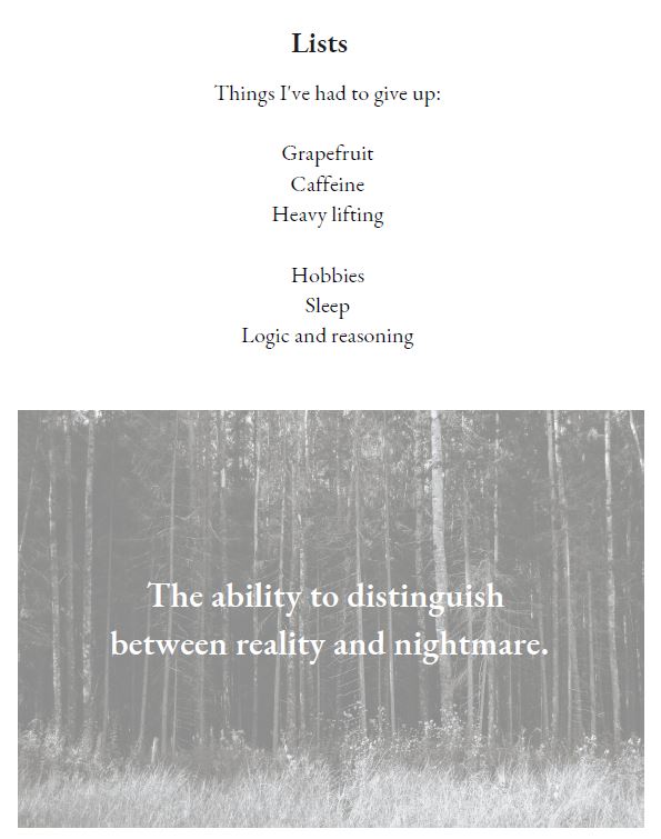 The pages’ stark black-and-white design is softened by background images of flowers, feathers, forests, candle flames, and shadows falling through windows. Although the tone is overwhelmingly sad, there is also some wry humour, as in the below.
