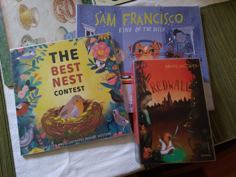 It’s been a lighter library month for me because I’ve been focusing on my own shelves. You can tell I’ve been looking for comfort reads during a damp, dark and illness-marred month, as there have been a lot of children’s books on my stacks, including Redwall, part of a series I loved when I was a kid. Rereading it 33 years or so later, it’s hard to recapture the magic, but I’m enjoying it well enough.