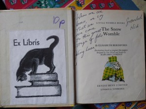 The Snow Womble by Elisabeth Beresford; illus. Margaret Gordon (1975) – I thought this would be a cute one to read even though I’m unfamiliar with the Wombles. But it’s just a one-note extended joke about the creatures not being able to tell their snowman version of Great-Uncle Bulgaria apart from the real one. The best thing about reading this was the frontispiece’s juxtaposition of elements: the computer-printed bookplate, the nominal secondhand price (withdrawn from London Borough of Sutton Public Libraries), and the wholly inappropriate inscription Grandad Nick chose from King Lear! (Little Free Library)
