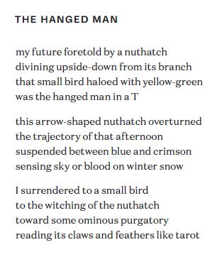Other poems describe birds, address them directly, or take on their perspectives. Birds are a reassuring presence (cf. Ted Hughes on swifts): “I counted on our robins to return every spring” as a balm, the anxious speaker reports in “Air raid siren.” A nest of gape-mouthed baby swallows in an outhouse is the prize at the end of a long countryside walk. With its alliteration and repetition, “The Goldfinch Charm” feels like an incantation. Birds model grace (or at least the appearance of grace):