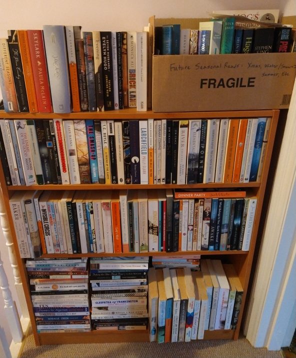 All through this process, I kept an eye out for books I was no longer keen to read. I ended up jettisoning another 81 (after the 90–100 I culled last year during our hallway redecoration), 17 of which I’ll sell; the rest will be donated to charity or the Little Free Library or given to book club friends as part of the book swap game we do for our holiday social each year.