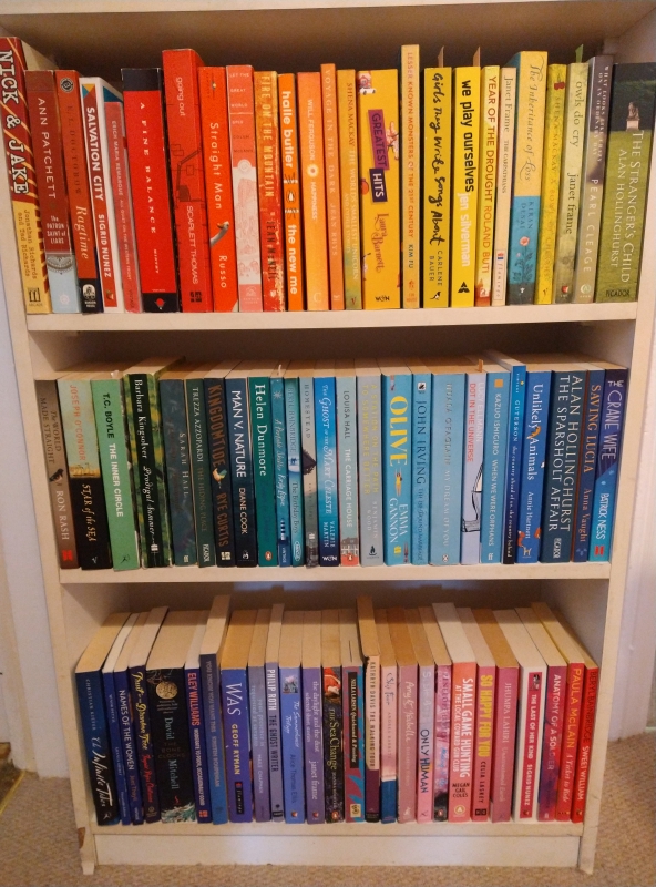Then, on a whim, I decided to mix it up by creating a rainbow bookcase on the landing. (To make it more of a challenge, I told myself I could use no Penguins for orange. And I put all the green Viragos together on a different shelf for visual impact.) This made me appreciate just how many books have blue spines, and dull white or black ones! I’m rather pleased with the result, but I will have to be loose about the contents: books will come and go as I read and pass them on, and add others in. In fact, I slotted three in yesterday – two green and a pink – after a trip to our local indie bookstore for my friend’s belated 70th birthday treat.