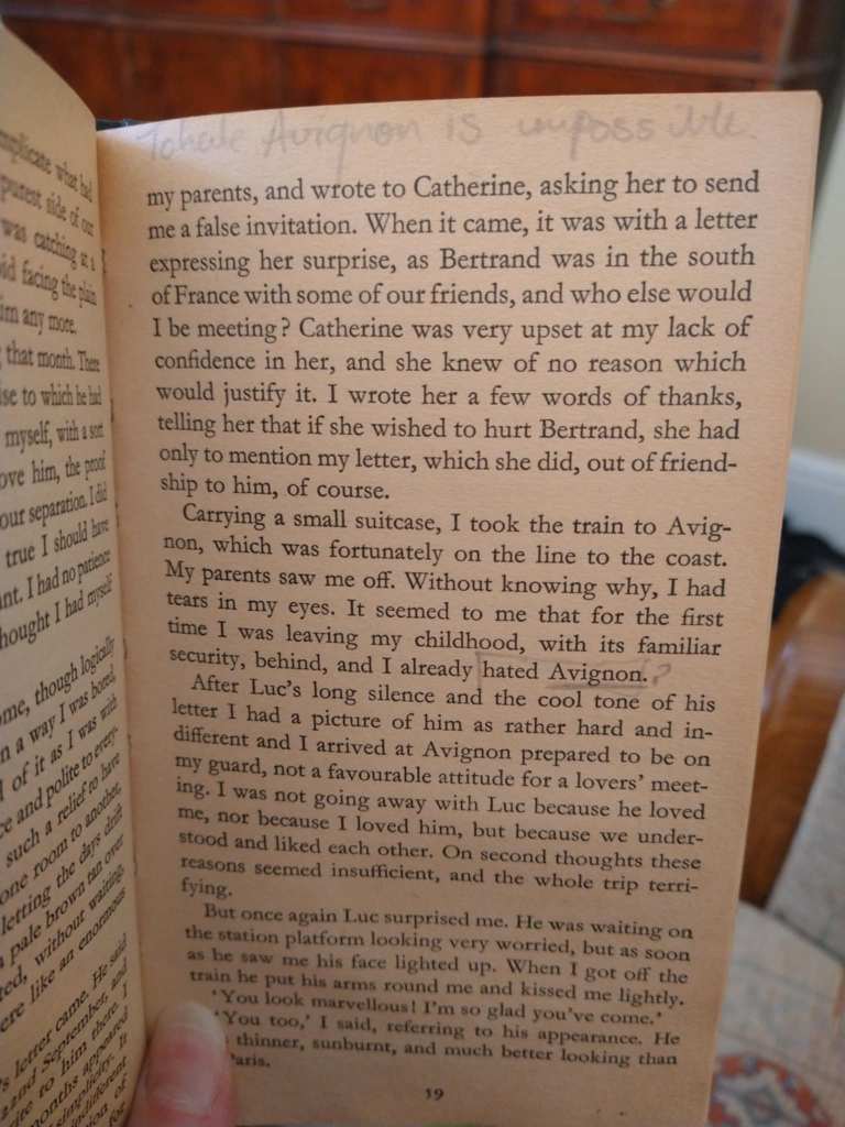 Law student Dominique is lukewarm on her boyfriend Bertrand and starts seeing his married uncle, Luc, instead. The high point is when they manage to go on a ‘honeymoon’ trip of several weeks to Avignon. Both Bertrand and Luc’s wife, Françoise, eventually find out, but everyone is very grown-up about it. The struggle is never external so much as within Dominique to accept that she doesn’t mean as much to Luc as he does to her, and that the relationship will only be a little blip in her early adulthood. I found this a disappointment compared to Bonjour Tristesse and Aimez-Vous Brahms – it really is just the story of an affair; nothing more – but Sagan is always highly readable. I read this in two days, a big section of it on a chilly beach in Devon. In its frank, cool assessment of relationship dynamics, this felt like a model for Sally Rooney. I had to laugh at the righteously angry and rather ungrammatical marginalia below (“To hate Avignon is unpossible”). (University library) [112 pages] ![]()