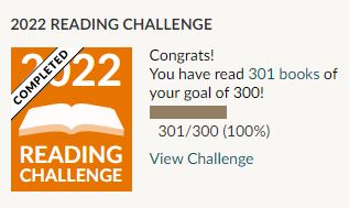 What with Covid ruining the holidays and a cat who’s been to the vet twice in two days, I’m wishing 2022 good riddance. (The only good thing the end of the year brought is a visit from my sister, who hadn’t been to the UK in 15.5 years. After a few cautionary days at a hotel in London, she’s been staying with us and enjoying the slower pace of life of these quiet, rainy days.) It was still a good reading year for me, though; I worried my total might plummet after my mom’s passing, but I found I read as much as ever, just maybe shorter books and more rereads. Late in the year I realized matching the previous three years’ total of 340 books wasn’t going to happen, so reduced my goal accordingly and managed to surpass it yesterday.