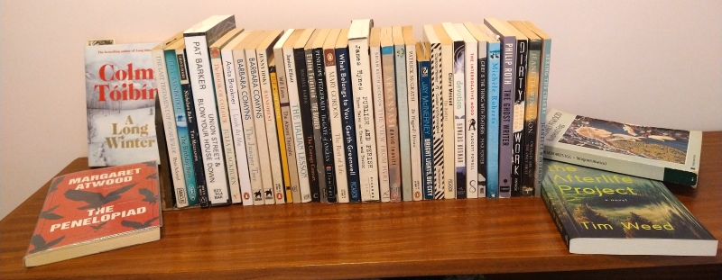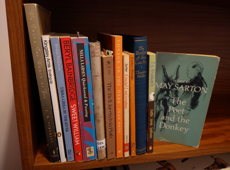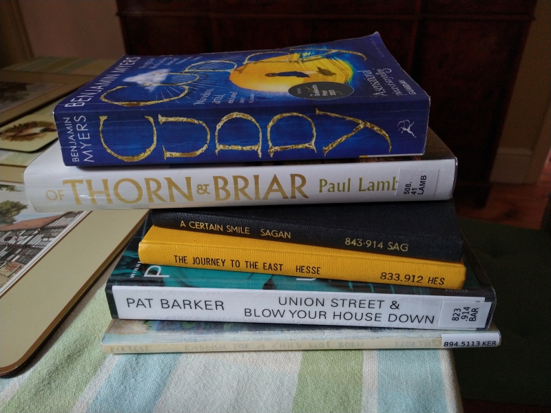 It’s nearly time for Novellas in November planning! Thus I borrowed a quartet of books from the university library (the bottom stack below), two of which were recommended by blog friends: the Barker (Blow Your House Down) by Margaret and the Hesse by Kaggsy. The Kertesz is on my radar thanks to C’s bandmate Jo. And I’ve enjoyed the two Sagan novellas I’ve read so far so thought I’d source another.
