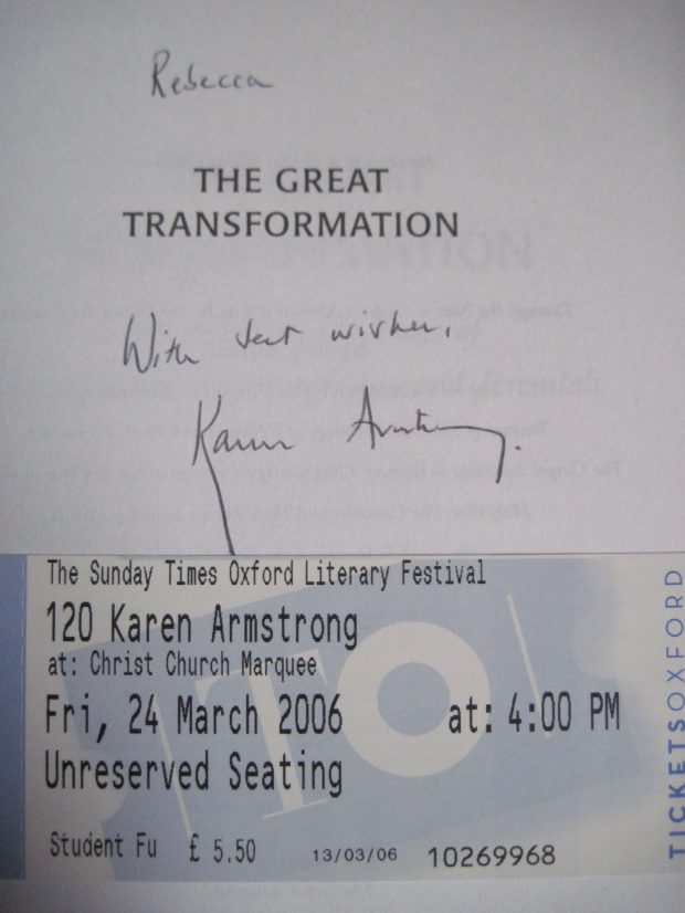 I love Karen Armstrong’s work, especially her two memoirs about deciding not to be a nun, and A History of God. I’ve seen her speak twice and am always impressed by her clear reasoning. (Tell you a secret, though: I couldn’t get through this particular book.)