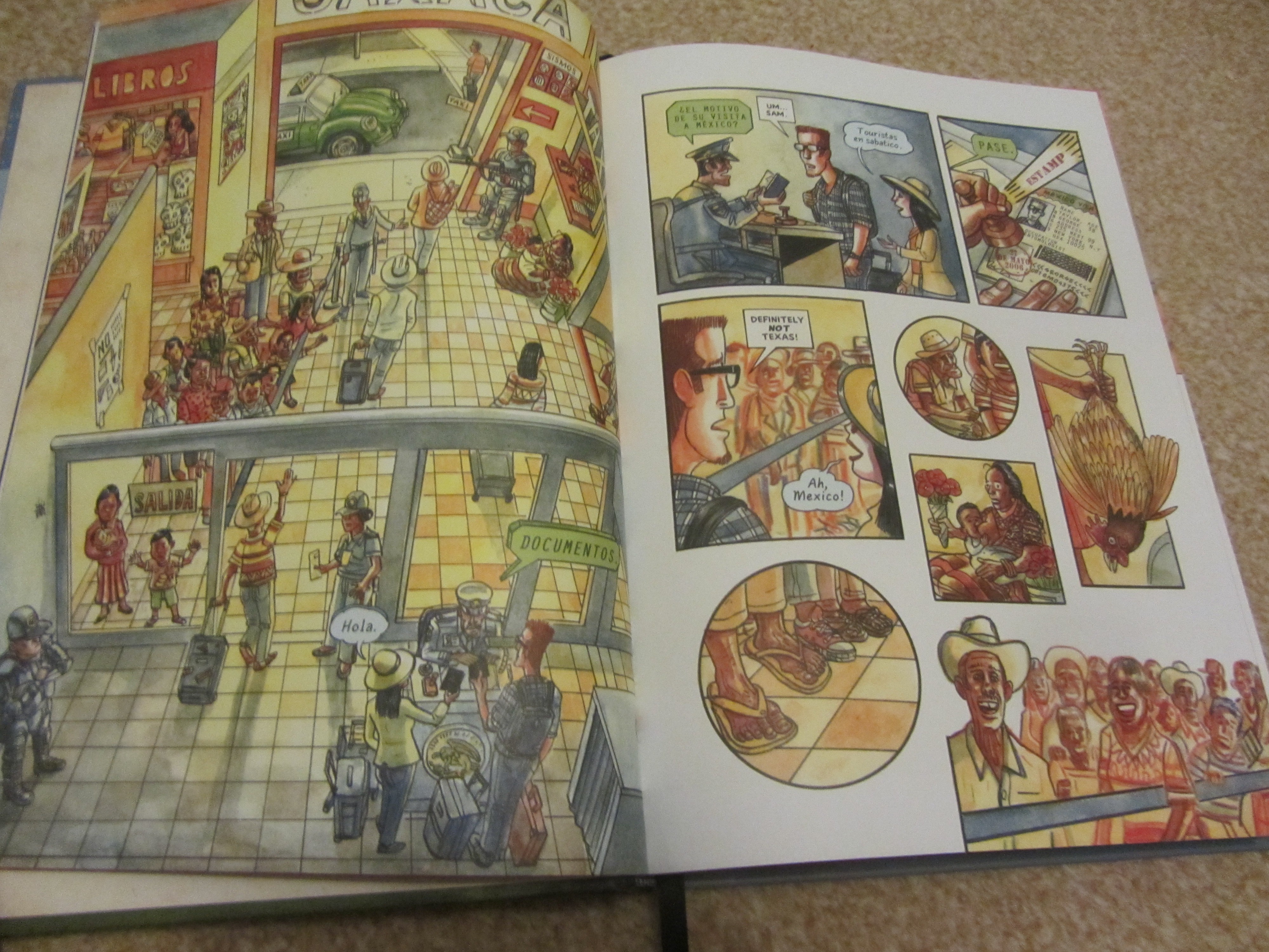 The environmental agenda comes through in the parallel story of one monarch’s migration. Sections set in Mexico alternate with short interludes showing the butterfly’s journey south from America to Michoacan, Mexico, where monarchs gather en masse in a pine forest. The limited palette of these spreads, in contrast with the vibrant colors of the Oaxaca scenes, is particularly effective: the monarch is generally the only speck of color against a monochrome blue-gray background showing rather dreary American scenes. Tagged in Pennsylvania, the monarch flies over polluted rivers, a nuclear power plant, an abandoned West Virginian mine, the aftermath of Hurricane Katrina, Monsanto tomato pickers, a Texas border arrest, and a Mexican drug deal gone wrong – a symbol of precarious hope in spite of circumstance.