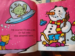 Scaredy Cat by Stuart Trotter (2007) – Rhyming couplets about everyday childhood fears and what makes them better. I thought it unfortunate that the young cat is afraid of other creatures; to be afraid of dogs is understandable, but three pages about not liking invertebrates is the wrong message to be sending. (Little Free Library)