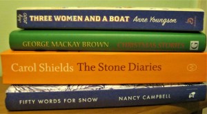 I still have these four print books to review on the blog. The Shields, a reissue, is for a December blog tour; I might save the snowy one for later in the winter.