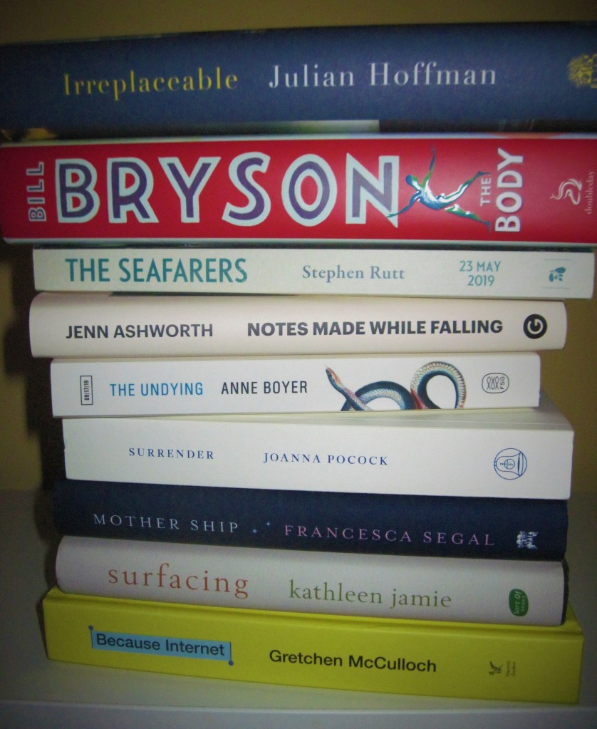 Surfacing by Kathleen Jamie: A fusion of autobiography with nature and travel writing – two genres that are too often dominated by men. Jamie has a particular interest in birds, islands, archaeology and the oddities of the human body, all subjects that intrigue me. There is beautiful nature writing to be found in this volume, as you might expect, but also relatable words on the human condition.