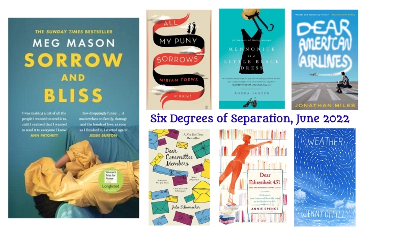 This month we begin with Sorrow and Bliss by Meg Mason. (See also Kate’s opening post.) This is my personal favourite from the Women’s Prize shortlist and couldn’t be a better pick for the Six Degrees starter this month because I’ll be skimming back through the novel this weekend in advance of my book club’s discussion of it on Monday. (We’re one of this year’s six book groups shadowing the Women’s Prize through a Reading Agency initiative, so we then have to give semi-official feedback on our experience of the book by Wednesday.)