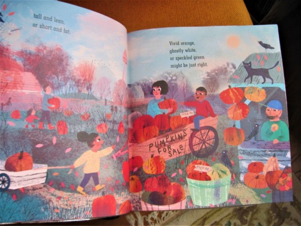 From picking the best pumpkin at the patch to going out trick-or-treating, this is a great introduction to Halloween traditions. It even gives step-by-step instructions for carving a jack-o’-lantern. The drawing style – generally 2D, and looking like it could be part cut paper collages, with some sponge painting – reminds me of Ezra Jack Keats and most of the characters are not white, which is refreshing. There are lots of little autumnal details to pick out in the two-page spreads, with a black cat and crows on most pages and a set of twins and a mouse on some others. The rhymes are either in couplets or ABCB patterns. Perfect October reading. (Public library)
