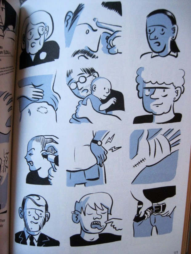 Williams was a GP in North Wales for 20 years; no doubt his experiences have inspired his comics. His tone is wonderfully balanced: there are plenty of hilarious, somewhat raunchy scenes, but also a lot of heartfelt moments as Lois learns that a doctor is never completely off duty and you have no idea what medical or personal challenge will crop up next. The drawing style reminds me of Alison Bechdel’s (and in the cover blurb she says, “Ian Williams is the best thing to happen to medicine since penicillin”), with single colors from pink to olive alternating as the background. I especially loved the pages where each panel depicts a different patient to show the breadth of people and complaints a doctor might see in a day.