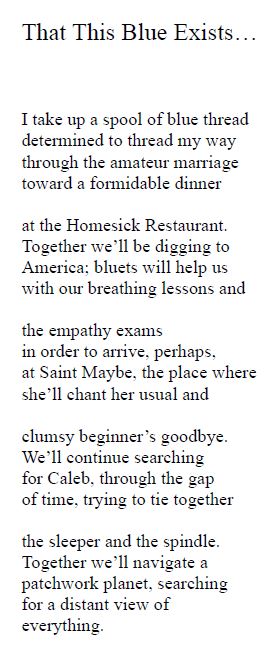 One could look up all of the artworks discussed, but the descriptions here are so richly detailed that I often didn’t feel I needed to. Two paintings in a row depict sisters. A poem about Salome and the beheading of John the Baptist draws on the Bible story, but also on its many portrayals through art history. Other topics include concern for the Earth and beloved works of literature. I particularly enjoyed “The Word in Joseph’s Hand,” a Christmas hymn that can be sung to the tune of “Lo, How a Rose E’er Blooming,” and a haiku about a cardinal, “a flash of bright red / … in the garden”. Below is my favourite of the poems; it incorporates the titles of 14 books, nine of them by Anne Tyler. See if you can spot them all!