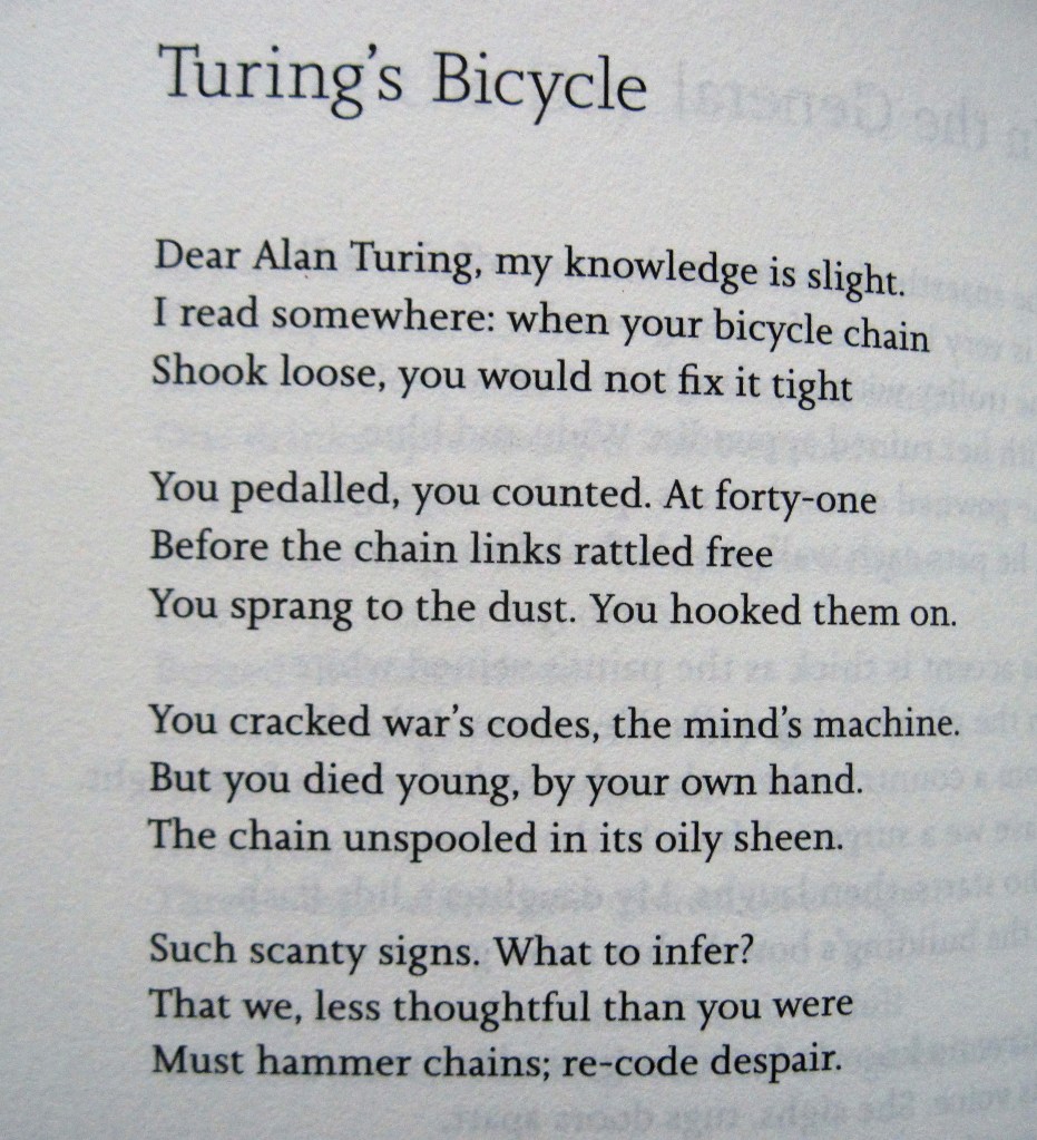Eaves’s protagonist, Alec Pryor, sometimes just “the scientist,” is clearly a stand-in for Alan Turing, quotes from whom appear as epigraphs heading most chapters. Turing was a code-breaker and early researcher in artificial intelligence at around the time of the Second World War, but was arrested for homosexuality and subjected to chemical castration. Perhaps due to his distress at his fall from grace and the bodily changes that his ‘treatment’ entailed, he committed suicide at age 41 – although there are theories that it was an accident or an assassination. If you’ve read about the manner of his death, you’ll find eerie hints in Murmur.