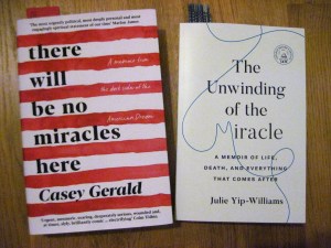 - Two titles that sound dubious about miracles: There Will Be No Miracles Here by Casey Gerald and The Unwinding of the Miracle: A Memoir of Life, Death, and Everything that Comes After by Julie Yip-Williams
