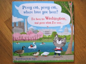 More cherry blossoms over tourist landmarks! This is part of a children’s series inspired by the 1805 English rhyme about London; other volumes visit New York City, Paris, and Rome. In rhyming couplets, he takes us from the White House to the Lincoln Memorial via all the other key sights of the Mall and further afield: museums and monuments, the Library of Congress, the National Cathedral, Arlington Cemetery, even somewhere I’ve never been – Theodore Roosevelt Island. Realism and whimsy (a kid-sized cat) together; lots of diversity in the crowd scenes. What’s not to like? (Titled Kitty cat, kitty cat… in the USA.)